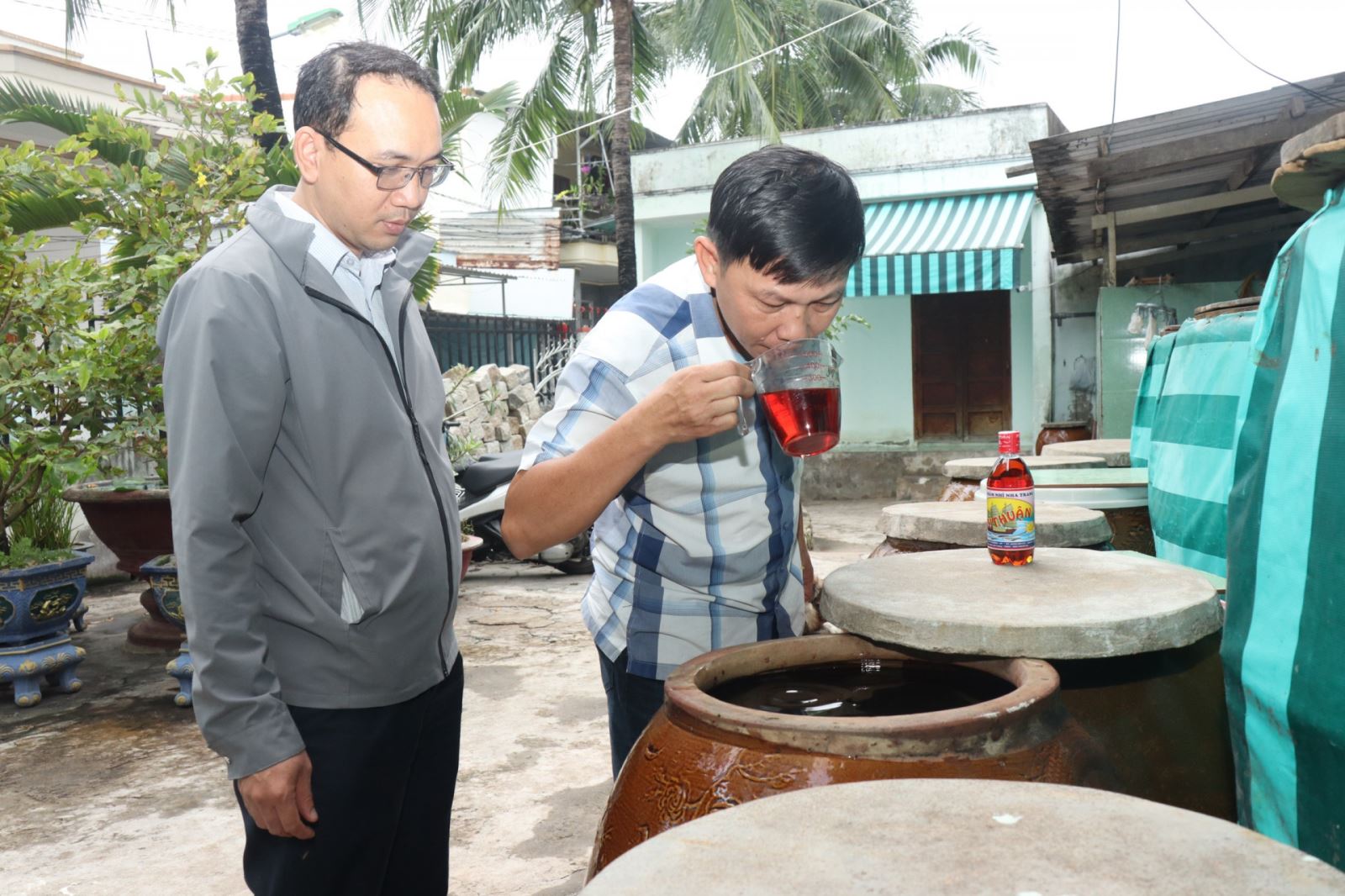 Ông Lê Huỳnh Như Thiên đang kiểm tra chất lượng nước mắm. Nguồn ảnh: baokhanhhoa.vn